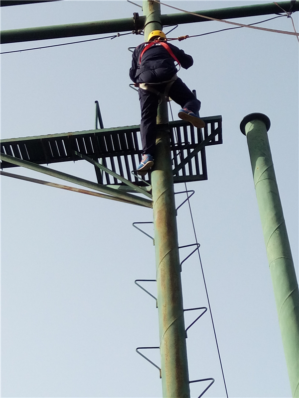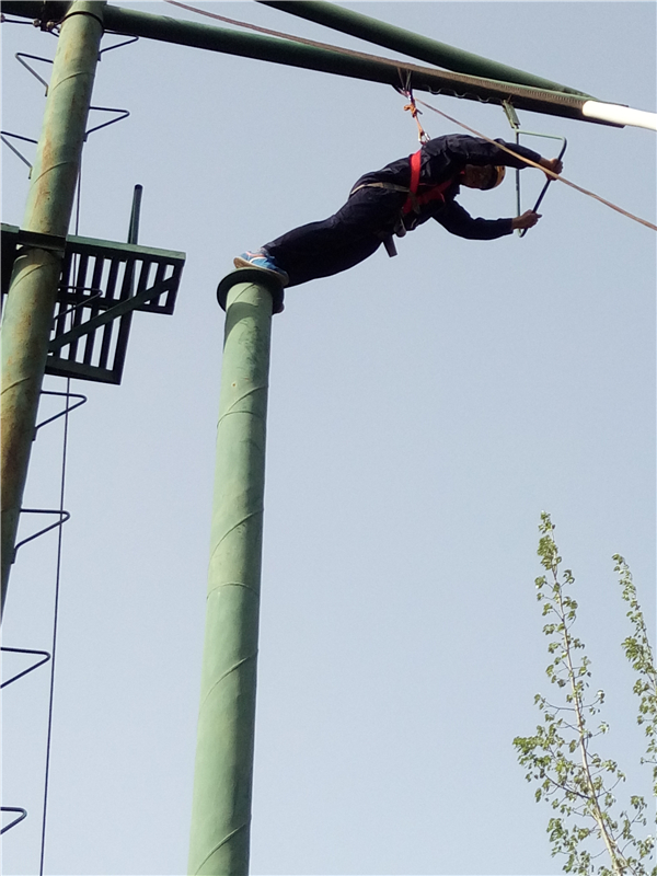 ? ? 這個項目是“高空抓杠”。要求隊員依次獨立的爬上立柱,在圓盤上站穩(wěn)后,雙腿同時用力蹬出,雙臂前伸抓住掛在前方的單杠。